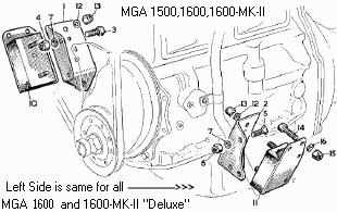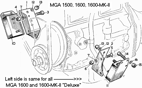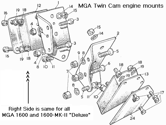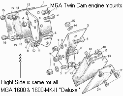The right side engine mount is different for the Twin Cam and "Deluxe" cars, but the right side bracket is same for all MGA. Left side engine mount is same for all MGA, but the left side bracket is different for the Twin Cam (very rare and difficult to find). So, the "Deluxe" cars have right side engine mount of the Twin Cam, and left side bracket same as all push-rod cars. (Click for larger pictures above).