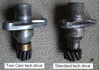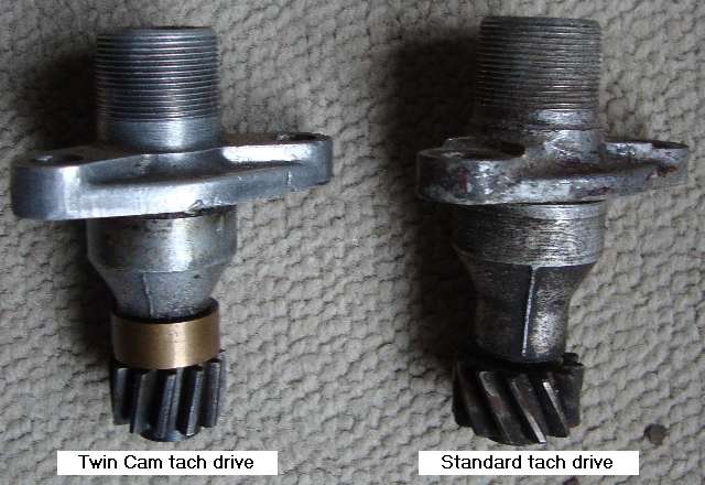 Using the same oil pump, the half speed shaft and the oil pump and tach drive gears have helical gear teeth spiraling in the opposite direction to maintain proper rotation for the oil pump and tach drive. With opposite angle on these gear teeth the thrust on the oil pump drive spindle is upward toward the block rather downward against the oil pump, and upward against the tach drive housing rather than downward on the block. The Twin Cam engine then has an additional thrust washer at top end of the oil pump drive spindle and above the tach driven gear.