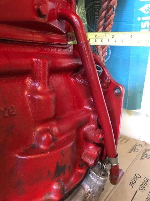 A crankcase vent tube is attached to the rear side cover (tappet cover for the pushrod engine). For early Twin Cam engines, the bottom bracket is attached with a 5/16 UNF bolt which screws the block behind the dipstick tube (photo at left). You cannot fit the bracket with the dipstick tube in place. For later Twin Cam engines, the bottom bracket is attached with a 5/16 UNF bolt through the engine back plate (photo at right). This has different part numbers for the rear side cover and vent tube, and they are not interchangeable.