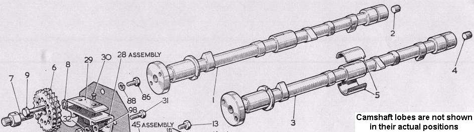 The camshafts must not be used unless they have rear plugs (items 2 and 4) and the front sprocket support spindle (item 7) fitted. This is necessary for correct lubrication to occur.