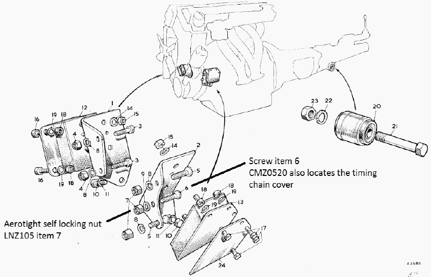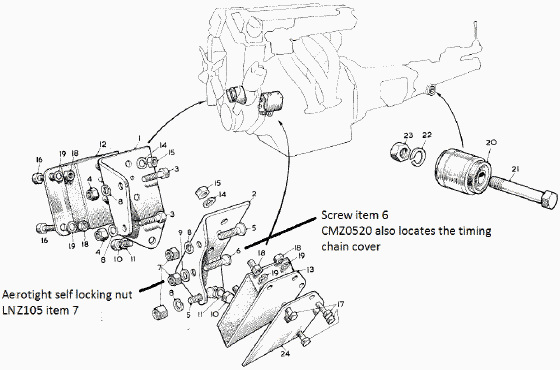 One of the locating screws is a recessed Philips head screw CMZ0520. This screw passes through the left side engine mount bracket, the engine front cover, and then through the timing chain cover. When attempting to undo the Aerotight type nut LNZ105, the self locking action tends to keep turning the screw making nearly impossible to remove the nut. The head of the screw is recessed and inaccessible.