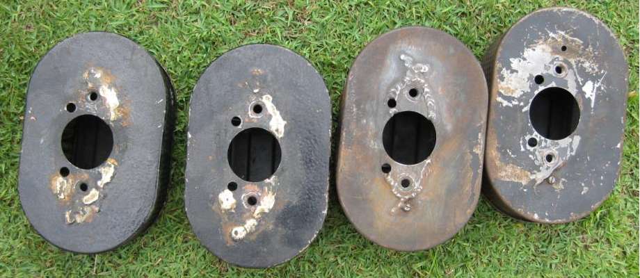 Here are some samples of cracked and badly repaired early type Twin Cam air filter backing plates. It strikes me that even with good welding ground smooth the cracks are destined to reappear again with more vibration. A proper production solution would have been to use thicker steel. My suggested field fix here would be to add a second layer of sheet metal, about 1/4 to 1/2-inch smaller than the original perimiter, all holes same, and solder the to pieces together to double the thickness.