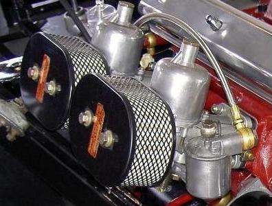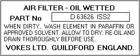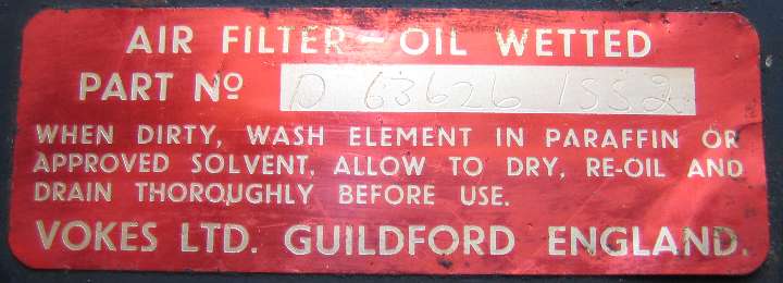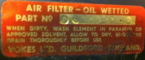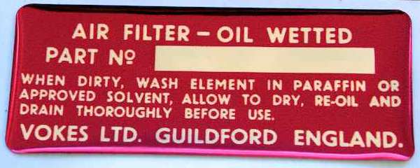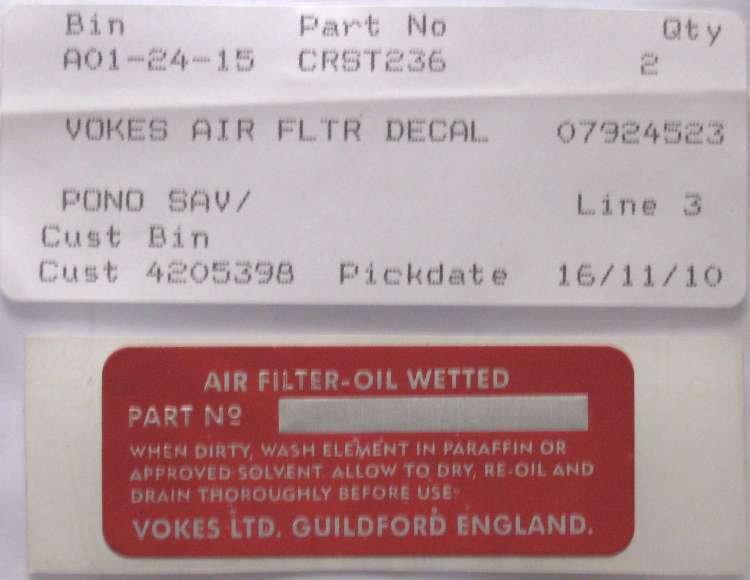 The 'Vokes' decal for the Twin Cam Air Cleaner is available from Brown & Gammons, part number BGS1060. This one is red and white, and it is paper rather than foil. The print pattern looks identical to the one above when compared in similar size. Recent report (Feb 2014) is that the stickers from Scarborough Faire and Anglo parts are also paper.