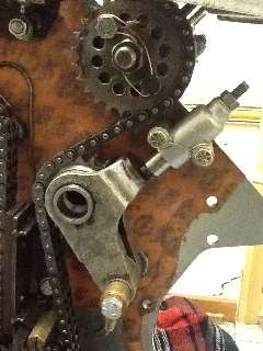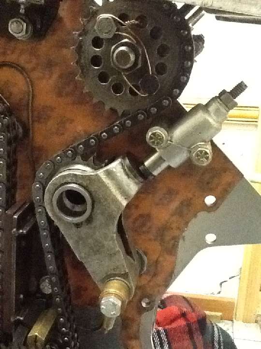 The concern now is how close the adjuster and chain are to the steel backing plate for the vertical chain damper and also the brass oil distribution pillar. As the chain is an original used Twin Cam chain, your problem is certainly a change to the original chain path in some way.