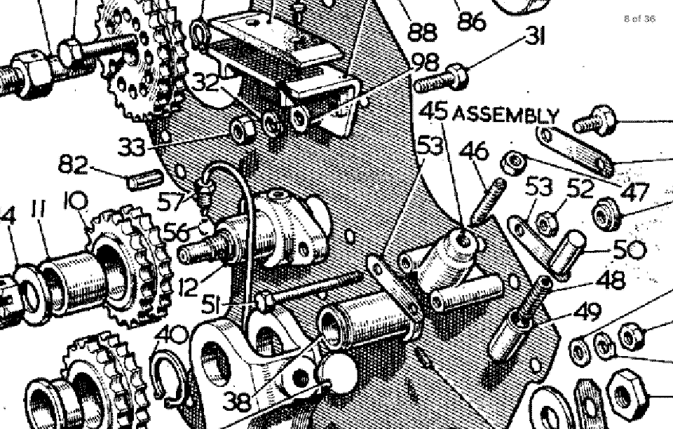 Refer to the prior pages for information on the chain adjuster, change of design and change of part number, and how to repair an adjuster arm that may have the thread worn or stripped. Also note there are chain guide sliders on the longer vertical run of the chain and on the top horizontal chain guide to suppress chain slap when it gets a little loose. Those pieces are lined with a hard plastic called Micarta which is riveted onto the brackets. Best to use countersunk copper rivets and copper locking washers here. Do not use steel or aluminum rivets, and do not use pop rivets.