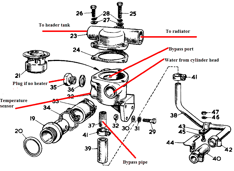 An explanation of the operation of the thermostat on a MGA Twin Cam. The following image and diagram show the main parts of the Twin Cam thermostat.