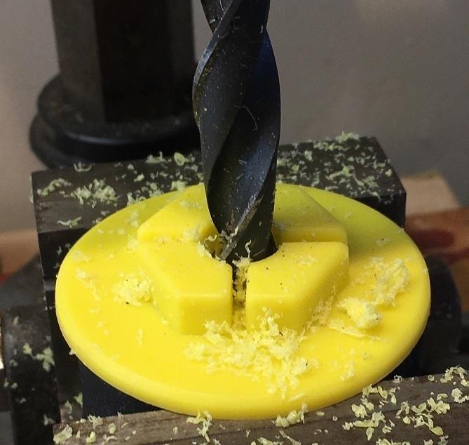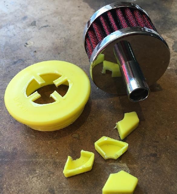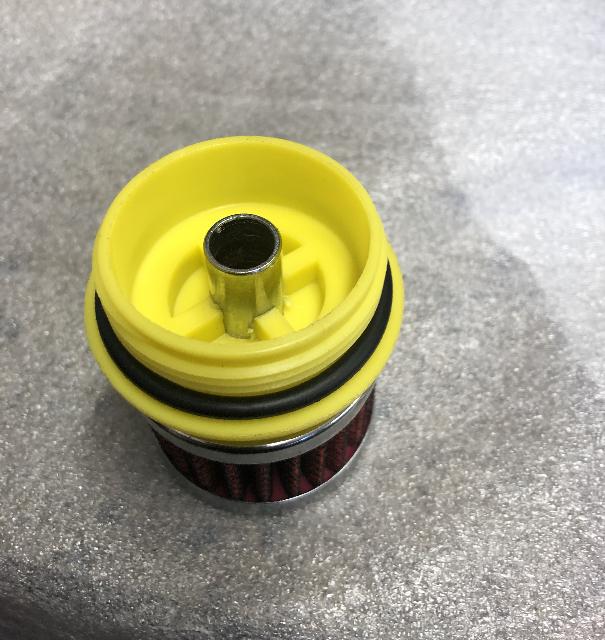 Here is another one (below) done by Andy Hinton in the UK, The center hole was drilled, but the extended hex boss was not removed. That makes it a bit taller with a small space below the filter shell. Andy reports that his filter fits well into the drilled hole and does not need to be glued in place. If you do want to glue these parts together, JB Weld works well. Not to worry about temperature resistance of the adhesive, as the plastic will suffer from heat long before it gets hot enough to bother the JB Weld.