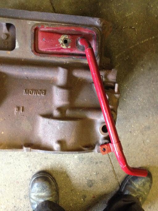 Note that there are two different styles of crankcase vent tube for the Twin Cam engines. Pictures at right show the early style with the bottom securing clip bolted to the side of the engine block. Notice the P-clip securing bolt is hiding behind the dip stick tube (which is part of the removable alloy sump). This implies that the vent pipe and bolt needs to be installed before the dipstick tube is installed, or before the sump is installed.