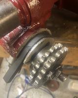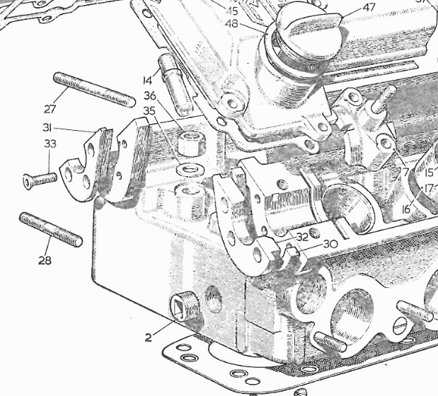Had some quesrions about a part called "Camshaft Seal", which actually seals between front of the cylinder head and the engine front plate. This seal is rectangular strip of rubber. Picture at right shows the cylinder head upside down with the sealpiece wrapped around another part called "Seal Retainer" (left and right handed parts). When right side up this seal nests into a curved recess in top of the front plate, two places.