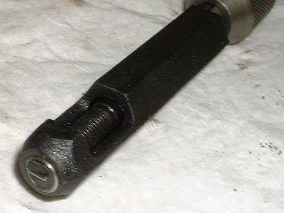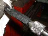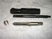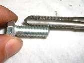 Above far right is a closer view of the HeliCoil insert. The HeliCoil is a diamond shape wire wound into a closely spaced coil, similar to a spring with the coils nearly touching each other. The diamond shaped wire has a 60 degree angle on each of the four surfaces to match the standard angle of the screw thread. At the front (or bottom end of the coil) the wire is formed into a straight tab extending across the center of the coil. The wire is coined with a notch just before the tab such that the tab can be easily broken off after installation. The repair tap is the same pitch as the original thread (picture below left), but slightly larger diameter to allow for the small space to be occupied by the new insert.
