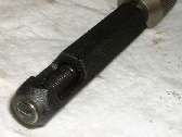 Drop the HeliCoil into the side of the coil guide, and insert the threaded driver through the barrel of the guide into the HeliCoil. Screw the HeliCoil into the guide with the driver until the first thread of the coil is exposed at the end of the guide as shown in the first picture on left above. Place the coil and the guide against the face of the part to be repaired, and screw the coil into the newly tapped hole while holding the guide stationary (second picture above). Continue to turn the driver until the coil escapes from the end of the guide, at which time the guide may be retracted a bit to give a view of the tail end of the coil (third picture above). Continue turning the driver until the tail end of the coil goes just below flush with the surface of the part, then stop and unscrew the driver, leaving the new insert in place (far right above).