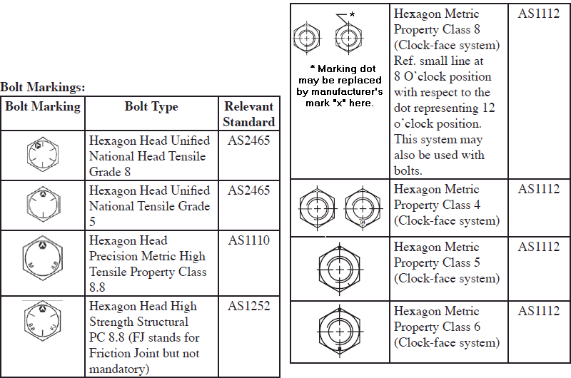 The strength and type of steel used in a bolt is supposed to be indicated by a raised mark on the head of the bolt. The type of mark depends on the standard to which the bolt was manufactured. Most often, bolts used in machinery are made to SAE standard J429, and bolts used in structures are made to various ASTM standards. The tables below give the head markings and some of the most commonly-needed information concerning the bolts. For further information, see the appropriate standard.