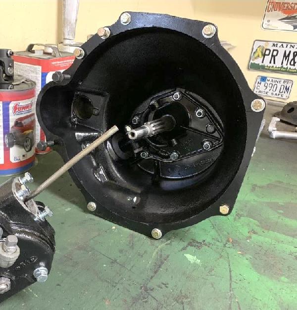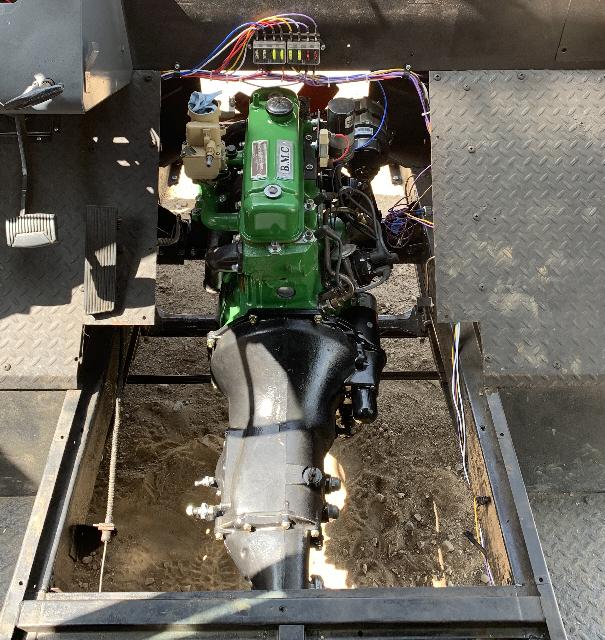 Photos below compliments of Jake Massey. Notice the gearbox is side shifter 3-speed, similar to Nash Metropolitan. The smaller black box is the worm drive steering box, and the tube extending fron the top will guide the wires into the steering column for the horn push switch.