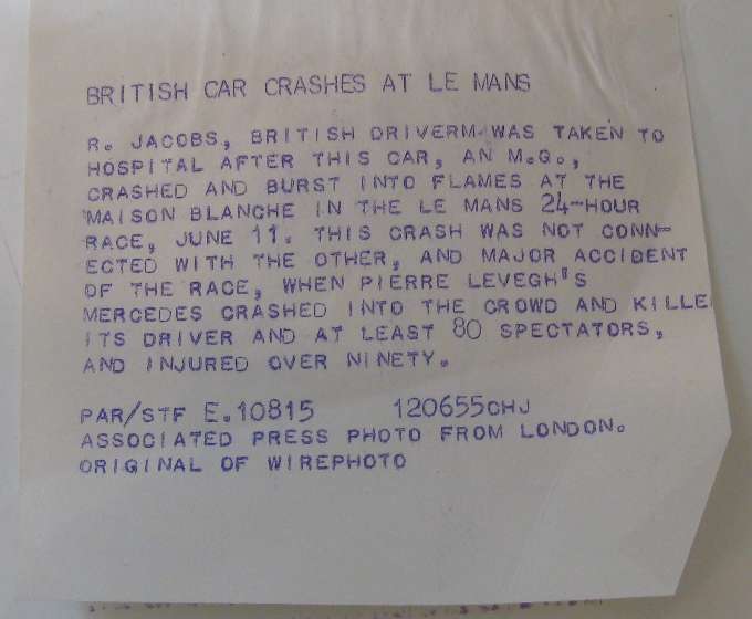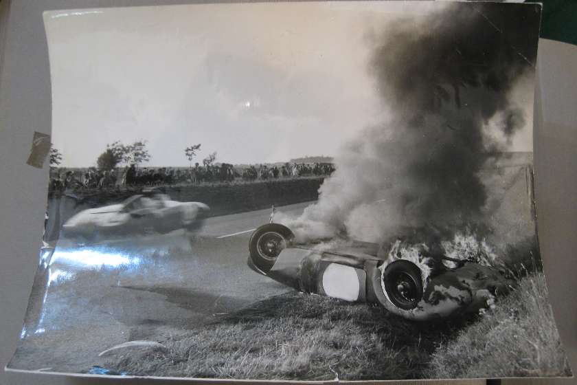 Photo from the Dick Jacobs Auction of his car burning at Le Mans.