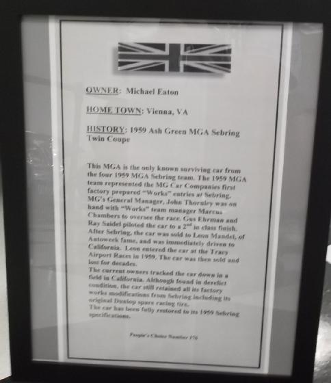 The only known survivor from the 1959 Sebring MGAs. Currently belonging to Michael Eaton in Vienna, Virginia. These photos from the showroom of Moss Motors east facility on May 27, 2014.