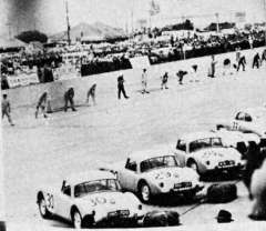 There was no entry in 1958 but 1959 saw the first entry from the factory and B.M.C. did it in a big way. The entries were not only for MGAs but a team of Austin Healey Sprites were sent as well. The M.G. entry was for three Twin Cams, which had been announced in the July of the previous year, and four cars were sent to Sebring, one being for practice. John Thornley, Geoffrey Healey and Marcus Chambers were to run the teams. Dougie Watts was the mechanic in charge of the MGAs. The drivers were drawn from North America in order to attract the best publicity possible for these cars. The Twin Cams, YD2. 931 to 934 had been constructed as roadsters but were converted to Coupe form by the Competitions Department. They were started in November, transferred to Competitions and left Abingdon on 9th February. The cars ran with the numbers 28 (Gus Ehrman and Ray Saidel), 29 (Jim Parkinson and John Dalton) and 30 ( Jack Flaherty, Ray Pickering with Sherman Decker as reserve). All these drivers were American and came from areas picked to give a spread of dealers within the regions. It was perhaps unfortunate that Sherm Decker was consistently faster than the others. This was the year that Gus Ehrman and Hal Wallace came up with a pressure refueling device that proceeded to pump fuel all over the pit floor during practice. The problems had been sorted before the race and much time was saved using the rig.