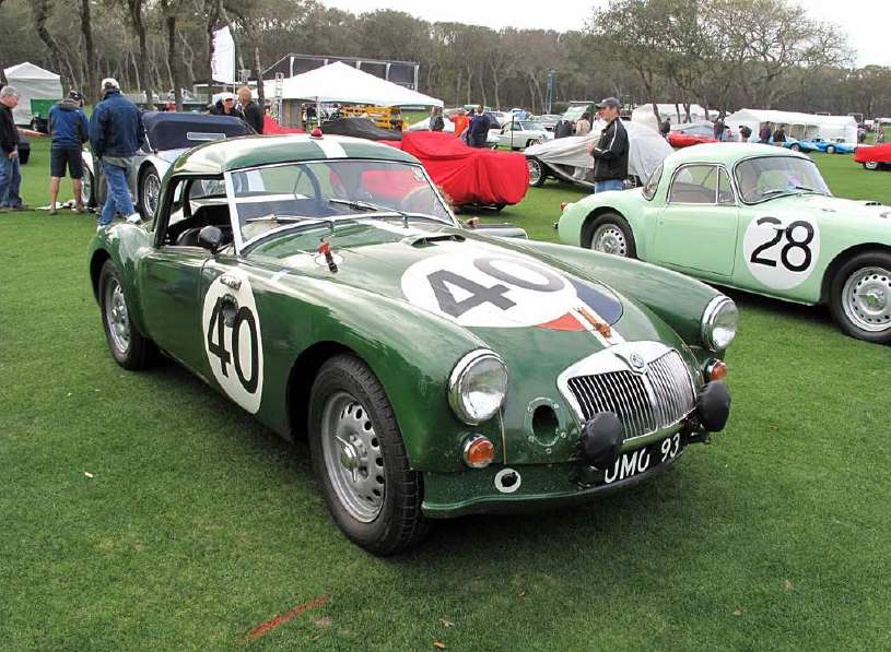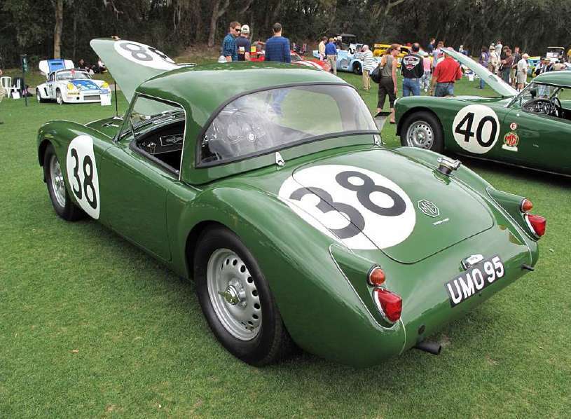 1960 Sebring MGA - These were 1600 style Twin Cam cars. The cars were roadsters fitted with bolt-on alloy hardtops. The body tonneau aft of the seats was slightly modified to allow stowage of a specified size piece of luggage as required by newly revised rules pertaining to production based sports cars. The folding convertible top was also deleted for the same reason. These five cars were ultimately to be the only Twin Cam roadsters on record with hardtop installed by the factory, and the only MGA roadsters to leave the factory without a convertible top. The light on top was to let the pit crew know the driver intended to pit on the next lap. The switch was located on the top of the dash. The lights were different color for each car so the crew could tell them apart in the dark.