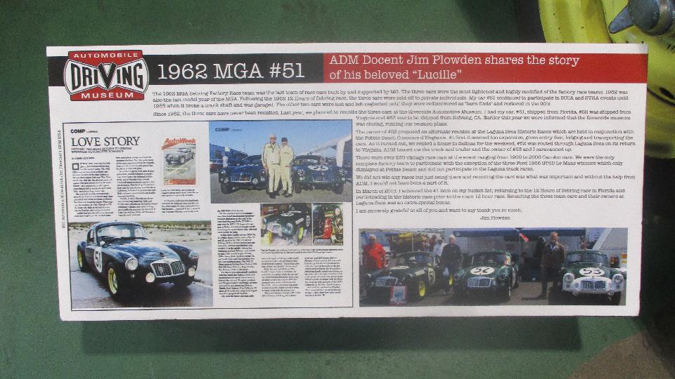 Today I got to visit Jim Plowden at the American Driving Museum in El Segundo, California (USA) where he is regularly a Docent, and where his Sebring race car was on display. It was the highest finishing MGA in the 1962 Sebring race. Here I had the chance to crawl around it, scratch, sniff, ask questions and take pictures.