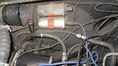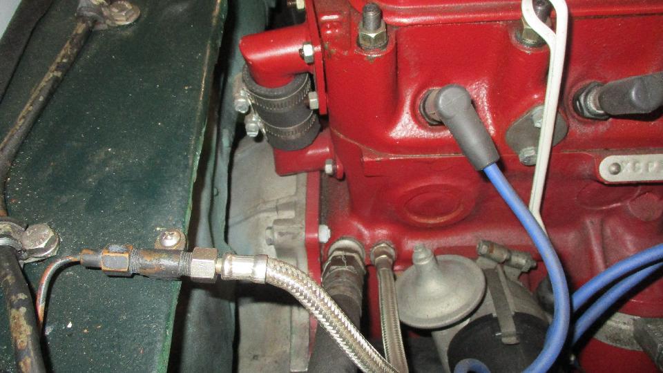 The air scoop in front of the windscreen is a vent directly into the cockpit. The double-elbow hose fitting on the back end of the engine is to pass coolant from block to head, as there was no head gasket and no coolant passages between block and head.