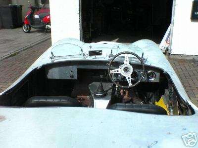 The car below is an MGA built in 1956, first registered in Feb 1957 in Southend on Sea, UK. The car now has MGB running gear with overdrive box. The body shell is a rare Microplas Mistral built in the 1950's as an aftermarket racing car shell. This appeared in eBay in late September, 2005.