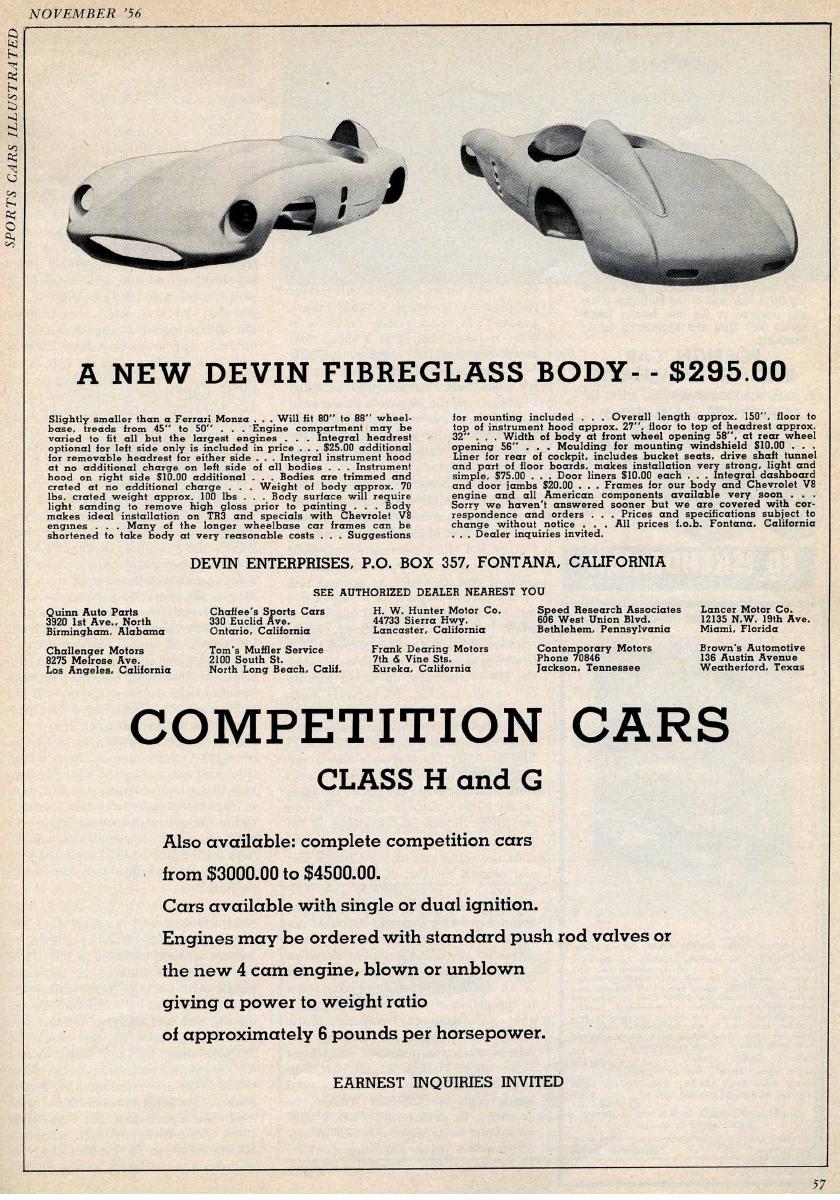 Devin bodies came in 26 different sizes, including some for 94 inch wheelbase that would fit MGA. The Devin has been so popular for use as a racing car body that people may have the impression that the Devin was an actual production car, like the Elva Courier. There were a few "production" cars built as turn-key deliveries, but there were far more bare bodies produced for custom builds.