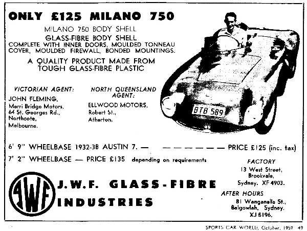 This "Milano" runs a supercharged MG engine…with a tubular frame and a fibreglass body built in Australia by JWF Glass Fibre-Industries (Sydney) in the late fifties.