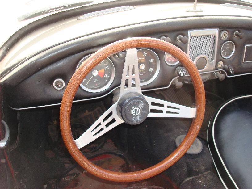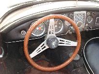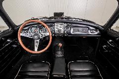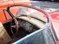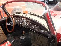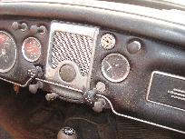 dhc20 = Dash covering has been re-done with padding (not originally padded). Two knobs below small instruments should be Starter pull and choke pull, but are not original style knobs. Dash instruments are early face style from first 14 months of production. Turn signal switch at left end of dash was originally a rotating wing knob to work a vacuum time delay switch, now maybe a 3-position toggle switch. I don't recognize the steering wheel, but the center piece looks like MGB or MG Midget style. No bump on right side of tunnel makes it low starter 1500 style.