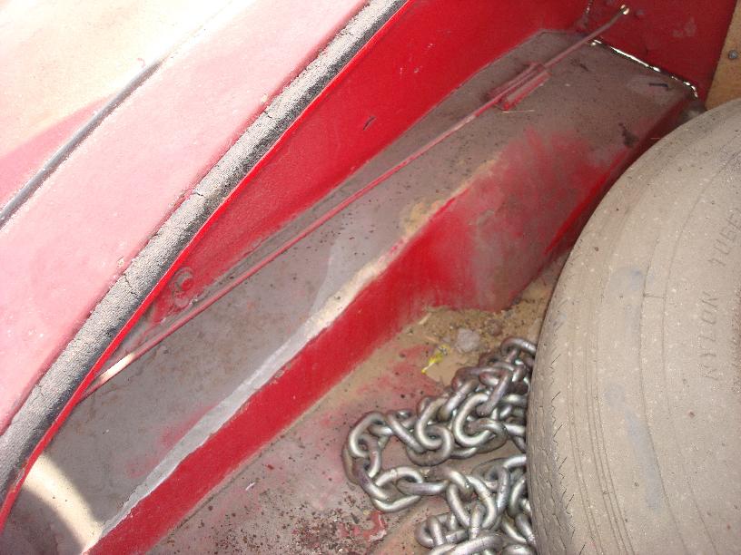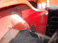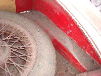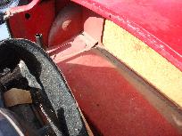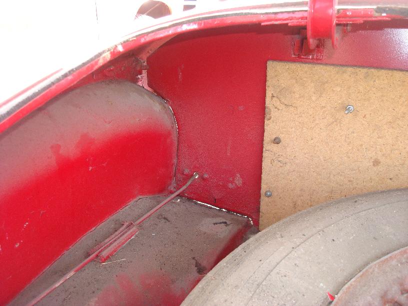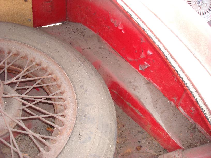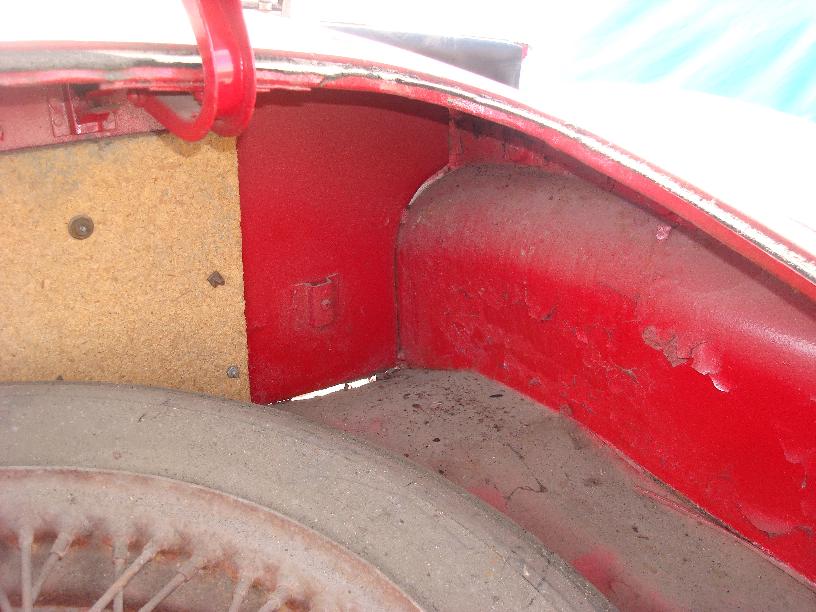 7748 - Red interior panel aft of door is different on right side. The hole at top may be intended to be anchor point for the removable top. Missing carpet cover where spare tire would originally protrude through the rear bulkhead (closed with plywood). Rear body tonneau still looks like roadster part.