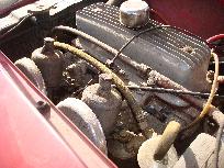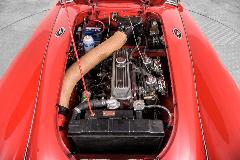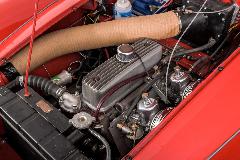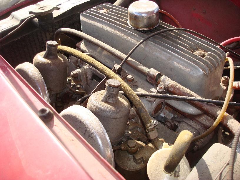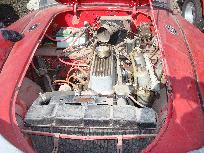 7757 - Battery does not belong in the engine bay. Heater box is radically different from original issue. Aftermarket alloy valve cover. Thin pancake air cleaners (restrictive to air flow). Two holes in the fan guard for different location of bonnet prop rod is April 1958 or later issue. Control box (voltage regulator) is in odd location aft of the carburetors. Transverse bracket in front of the radiator is non-standard, likely a modified bonnet latch part. Body inner fender style is "pre Twin Cam" (prior to April 1958).
