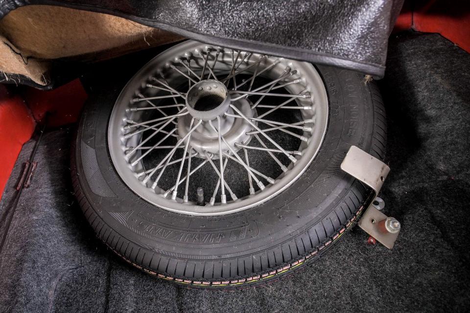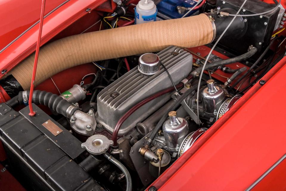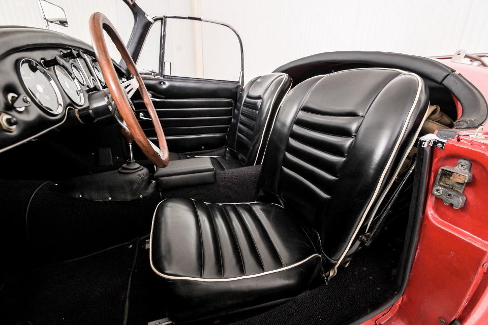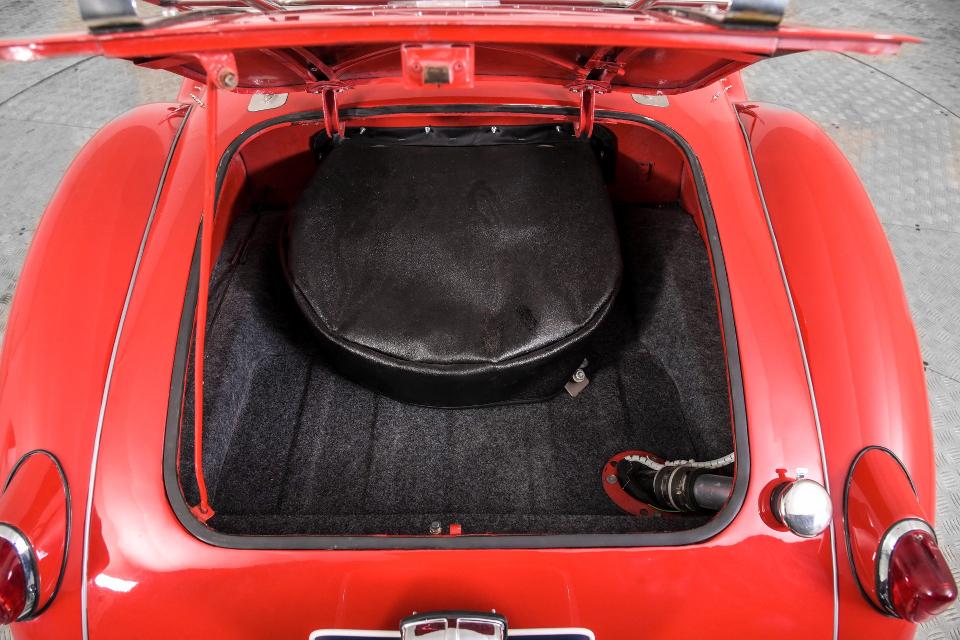 Three dash instruments are Jaeger early 1500 face style, while the fuel gauge is non-standard Smiths. The dash panel with bright trim on lower edge and chrome speaker surround is original Coupe style, but the padding is not original. Starter and choke controls and steering wheel are not original style. The boot floor and bulkhead are commensurate with MGA 1500 Coupe style.