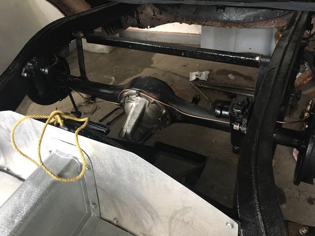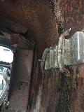 "A photo of the engine in the car. The rear axle assembly was provided by MGA builder Mike Finch. It's great to have so many friends involved in the project. Hopefully the remaining bits arrive soon so the car can roll before winter. The last photo shows the inside of the LF fender, looking back toward the door pillar. You can see the silver side vent on the right, and a joint in the fender about midway through the vent opening. Can anyone identify the door post and hinge plates? (another clue..)
