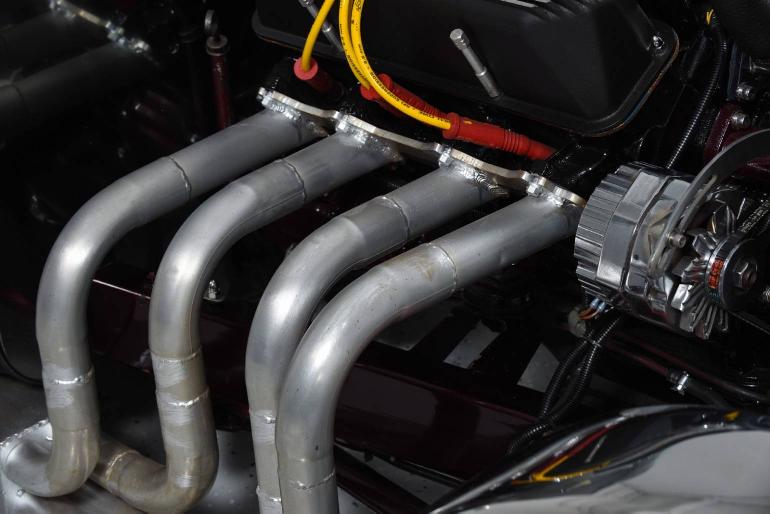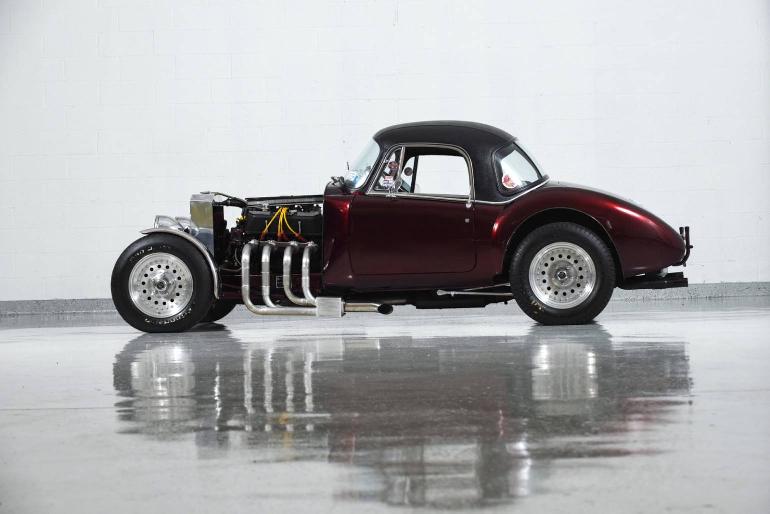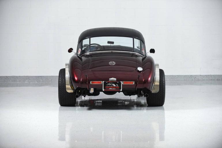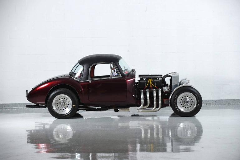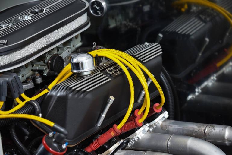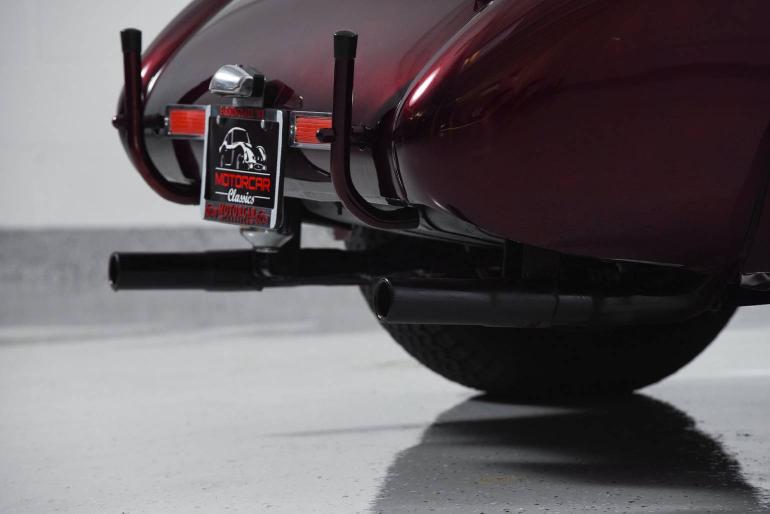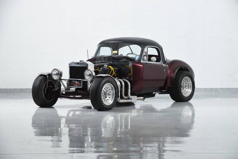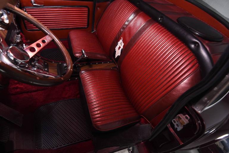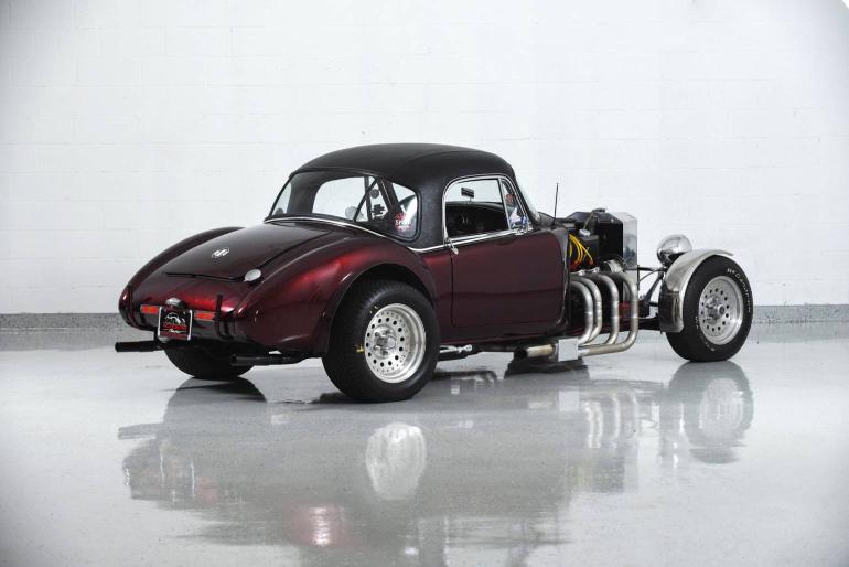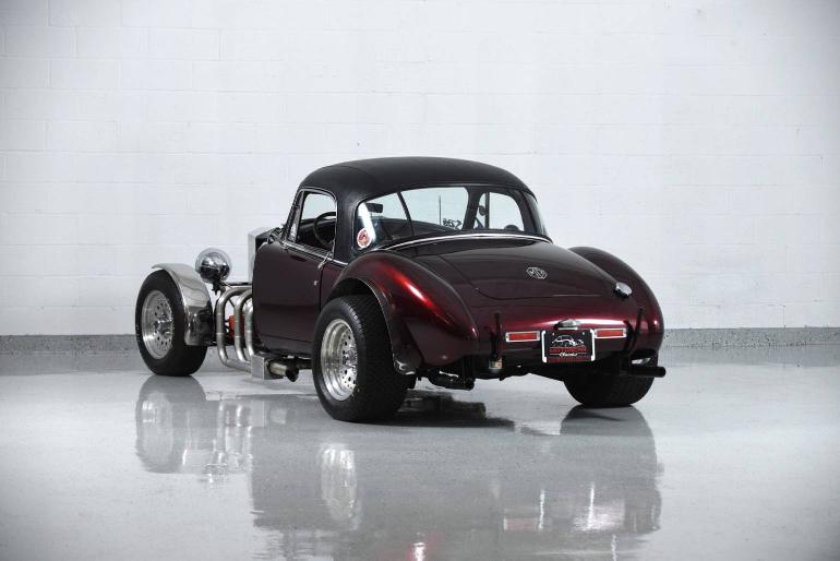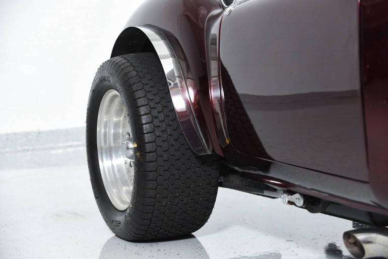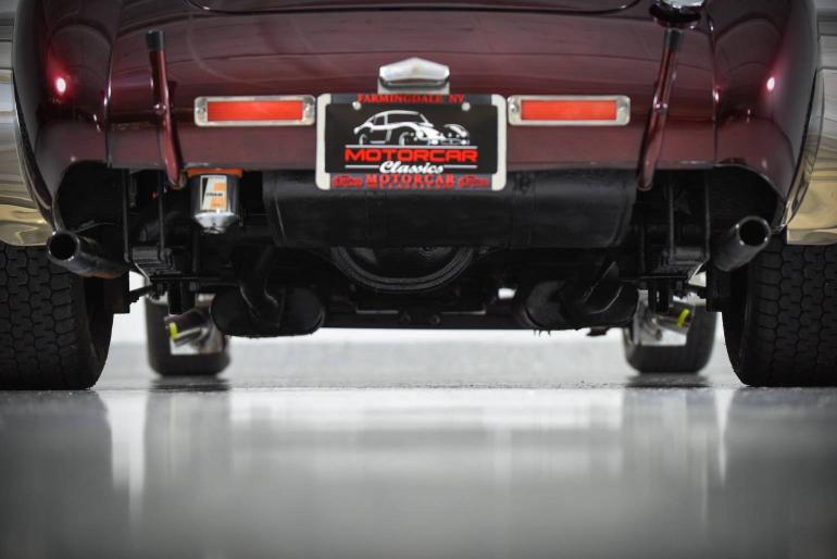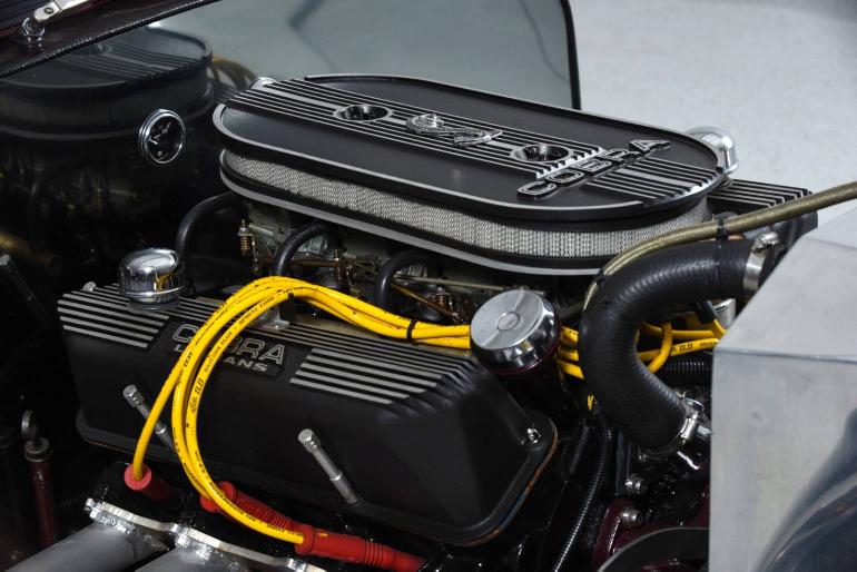 This one was for sale in January 2017. For as long as the page may be available, see Hemmings. Perhaps this page may help with publicity to promote the sale or future value of the car. The short of it is, Ford 428 Cobra Super Jet V8 with Tri-Power carburetion, Ford C6 3-speed automatic transmission, Ford 3.83 rear. About 600 HP in a 2200 pound car. Depending on tire size, about 115-120 mph at 6000 rpm (before you blow up the engine from over speed).