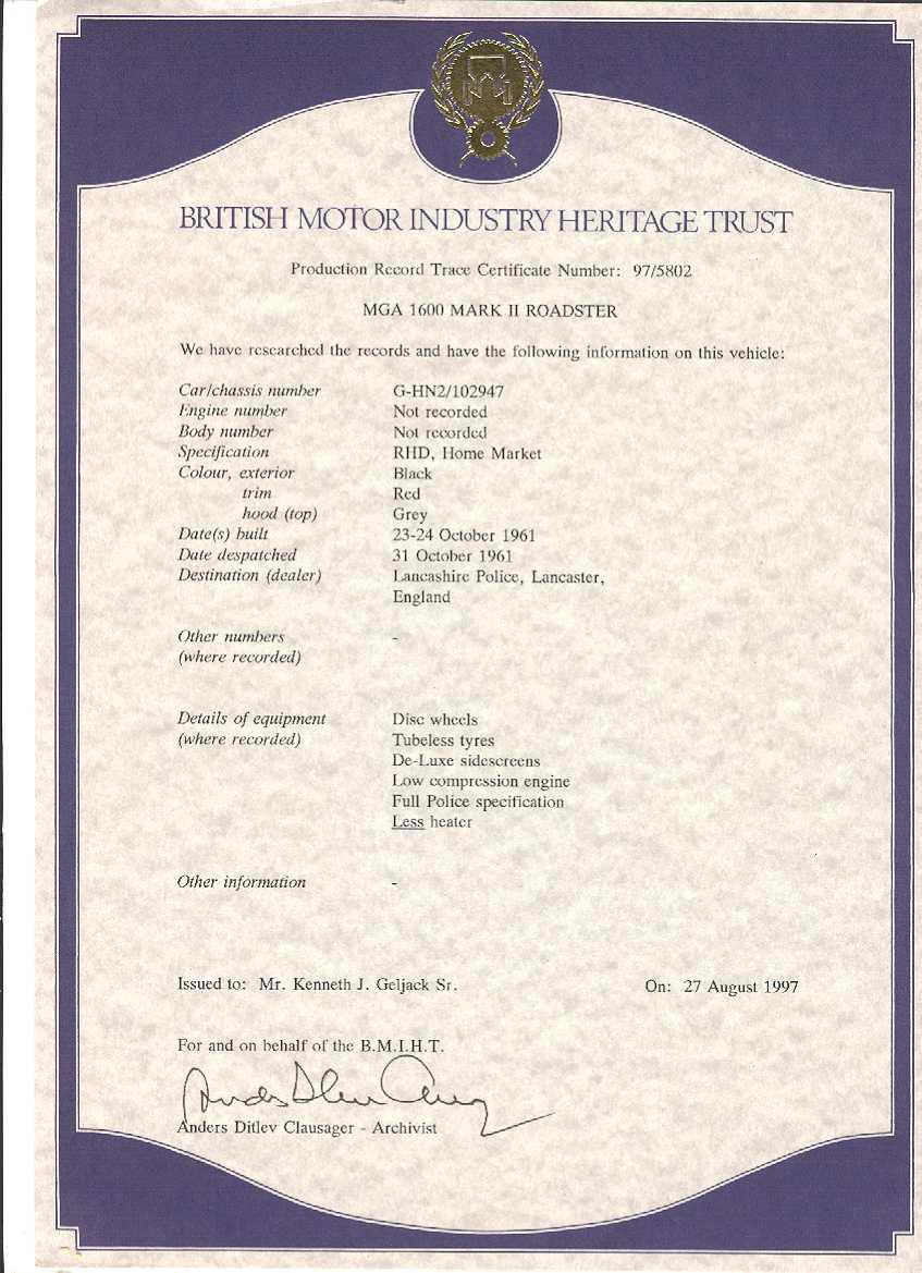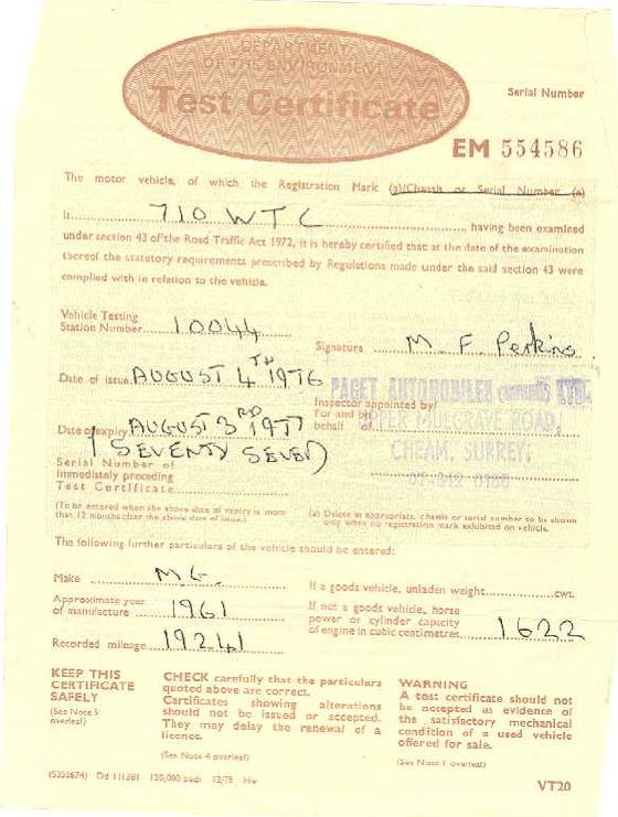 Production Record Trace Certificate, 1961 --- Test Cretificate, 1976