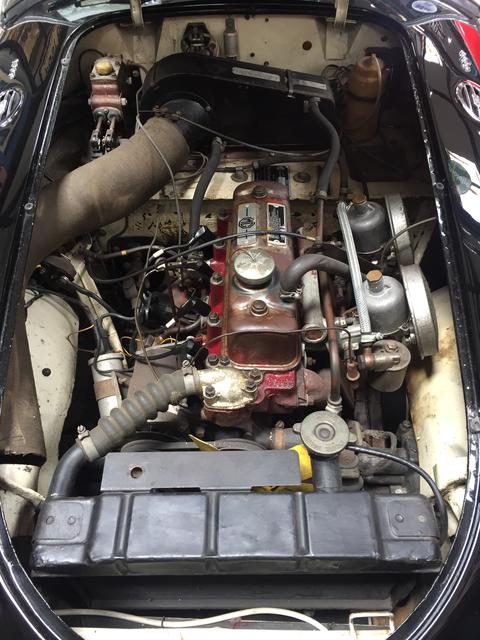 This photo was supplied by Mark Cox in San Carlos, Califonia, USA, on 23Jul2016. It shows white engine bay, implying that the car was originally white and later resprayed back on the outside only. As far as I know, no one has ever checked the Heritage information to verify original color of this car. Story is that beat bobbys/coppers had the black MGA's but the sergeants and above had white cars. So this may well have been a white police car originally but re-sprayed black to look cooler and more like what us Brits would expect a police car to look like patrolling the streets. Or possibly if the supervisor got a new car the old one might be resprayed back to be passed on to a beat cop.