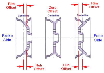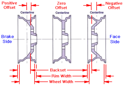 Not confused enough yet? Another way of measuring wheels is to refer to "backset". Backset is the distance from the inboard rim edge to the bolt-on mounting surface of the hub. Lay a straight edge across the inner rim and measure to the mounting surface, and you get backset as a direct measurement. Measuring across the full width of the rim gives you "rim width". Measuring in between the tire bead mount surfaces gives a consistent measurement of what is ALWAYS referred to as "wheel width". You can easily convert measured overall width and backset measurements to offset dimension by the formula B-(W/2). Rim edge design makes no difference, as W/2 is always the centerline of the rim regardless. The result may be positive or negative depending on wheel shape.