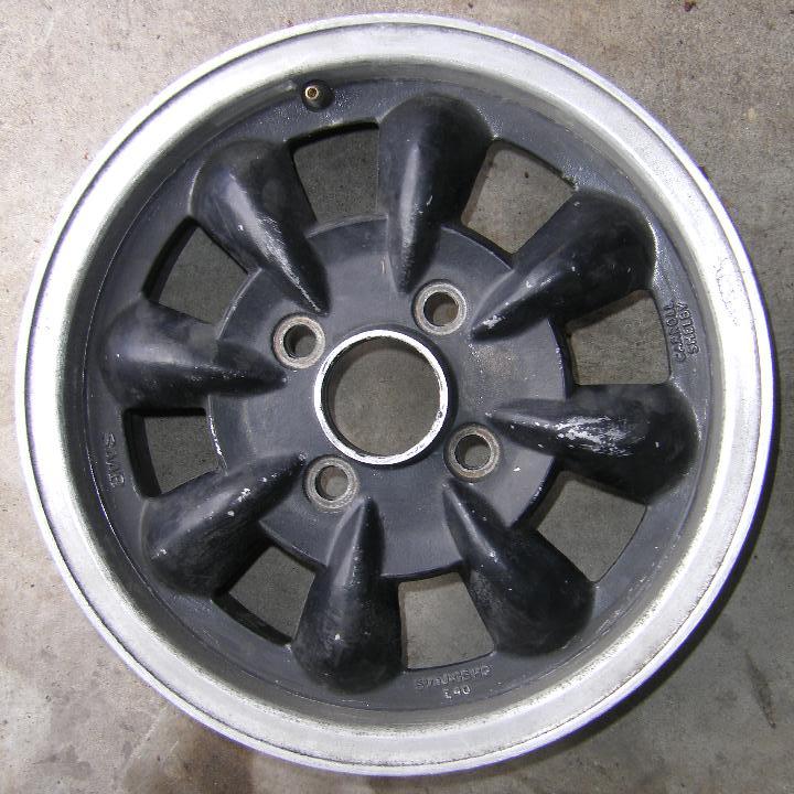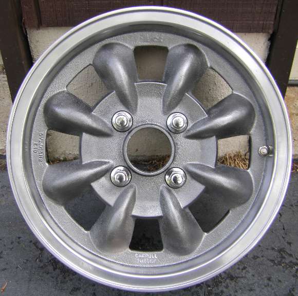 Some Saab cars had a 15" aluminum wheel with the correct offset and bolt pattern, and they have a design and appearance similar to Minilite 8-spoke aluminum wheels. These are (Carroll) Shelby-Ronal wheels from a ’86 Saab 900 Turbo. The Minilite replica wheels are nearly $200 each new. The Saab wheels used might be less than $50 each at a bone yard (but getting more scarce with time). Then you figure out how to fit an MG emblem to the center hub. The Saab center caps that came with the wheels are octagon shaped, same as the center caps on the Saab Inca wheels. The adhesive MG logo for the stock MGB RO-Style wheels fits perfectly in the center of the Saab cap.