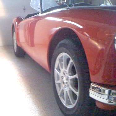 FINALLY, an alloy wheel with the correct offset to fit the MGA. This is a Honda front wheel drive specification. Of course being 6-inches wide they will only work with wide tires. I knew from my autocross experience that 195 tires would fit the MGA with correct offset wheels. I presume the four extra holes in the center will be for a slightly different bolt pattern for some other application. These 10-spoke wheels are not "period correct", but they don't look bad on the MGA (just a little odd on first glance).