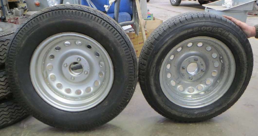 On left is the G.K. wheel 4-1/2x15 with 3/4" offset and 185-80-15 tire.