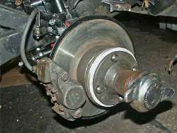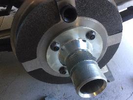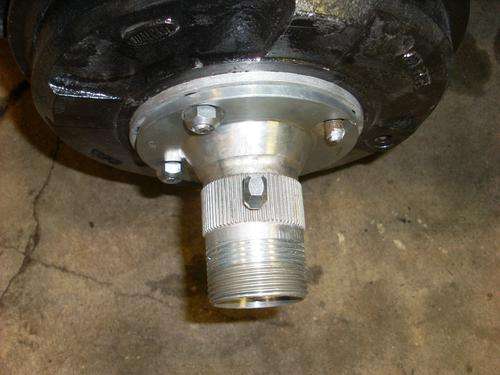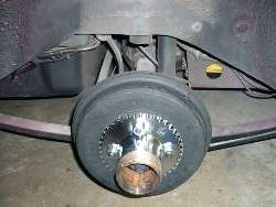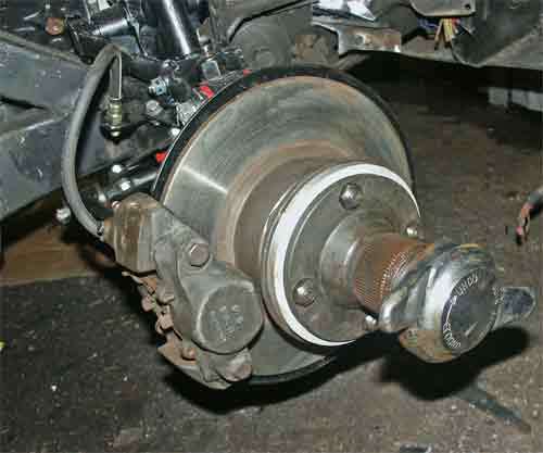 A possible alternative to cutting the studs shorter is to install a spacer plate just inboard of the splined adapter hub, as shown above and below. This will set the wheel and tire even farther outboard, but it makes the process reversible without replacing wheel studs.