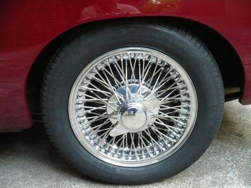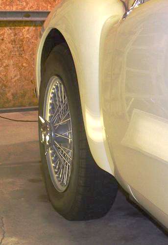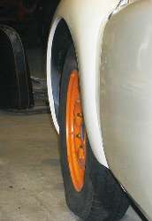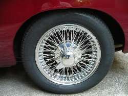 This article is dedicated to the problems of using bolt-on wire wheel adapters on the MGA. The first point to make and to remember is that the wire wheel rear axle is 7/8-inch shorter on each end to allow for length of the splined hub. If you bolt-on a splined hub like the TR6 part shown immediately below, it will offset the tires outward about one inch on each side to increase track width about two inches. Some people like (or don't mind) the wider looking stance, but this positions the tires perilously close to the rear fenders. It can work with standard size tires on original configuration wire wheels, but with the wheels set outward that far it is unlikely to accept any tires wider than standard issue (about 165-80R15 maximum tire size). In other words, this only works with more or less standard size tires, and it makes the car look odd. Check out these pictures for comparison.