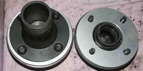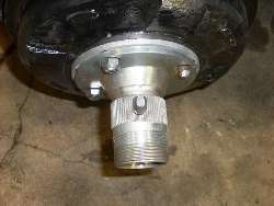 Additionally, these adapters want to use hex drive round head bolts for attachment (see photos below). To use hex nuts on the standard studs you need to cut the studs shorter and round off the outer end of the nuts to clear the inside of the wire wheel hub. If you don't to this the wheel will hit the studs or nuts before mating with the intended conical seat at the inner end of the hub. When not properly seated the wheel will work loose, quickly damaging the wheel (possibly hazardous to your life).