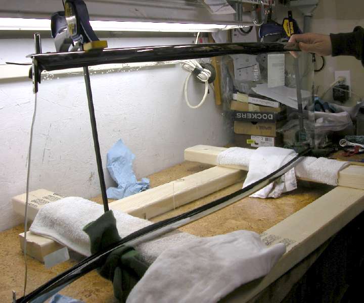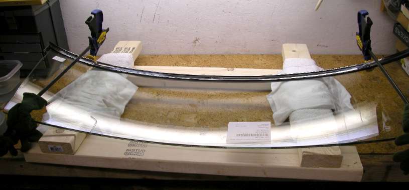 In the Moss MGA catalog there is a full page copy of a Service Memorandum, dated 2 July 1962, related to "Windscreen Re-glazing". This makes a big deal about how you need to put a packing piece in the bottom frame rail to support the glass. This is to assure that the bottom corners of the glass do not sit on the L-shaped metal corner brackets inside of the frame, which is known to cause cracking of the lower corners of the glass. Well, the Moss supplied glass is different than the original glass. The general size of the piece is a bit larger in height, and then the edges are relieved a little for the first couple inches from each corner. This allows the glass to sit on the glazing rubber at the bottom without touching the corner brackets, and also eliminates the need for the extra packing piece in the bottom. Same goes for the other edges and corners of the glass, no way for the corners to touch anything except the glazing rubber. So, no extra packing piece is needed in the bottom frame (won't fit), and you can dispose of the original piece of wood you (may) find there.