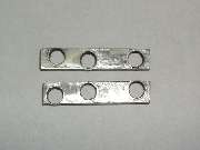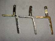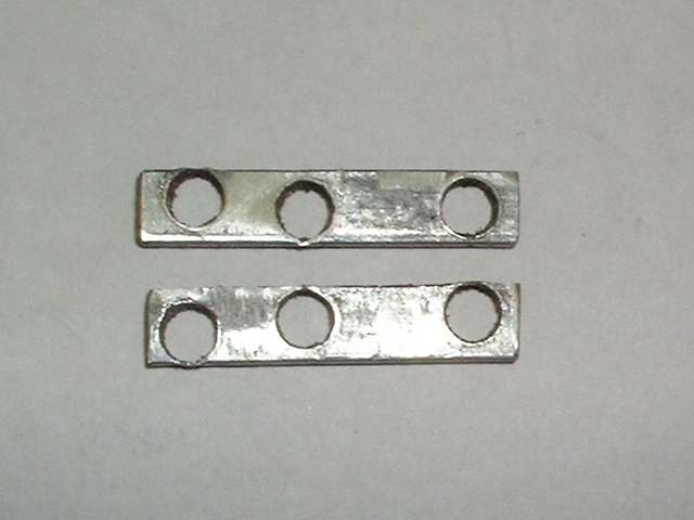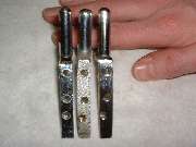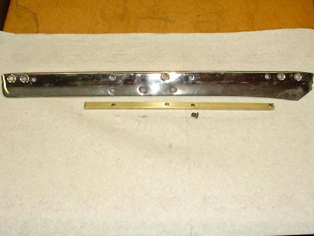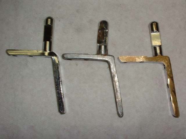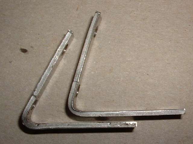 Next we have the top corner brackets, two required, with the parts shown here being from the right hand side. The part in the center is an original bracket as installed on the car from the factory. It is a 100% brass casting with chrome plating. The part on the right came from Moss Motors in November 2001, and from my experience it is the same part they have been supplying for several years. It is a 100% brass casting with chrome plating as original, but unfortunately it didn't fit. The angled part of the bracket was too thick to fit into the slots in the windscreen frame parts, and it required considerable grinding on both sides to thin it down enough to fit. This was not just interference caused by the thickness of plating, but substantially more. I had to reduce the thickness of the part by about .015 inch before it would fit into the mating slots. Then some of the threaded holes were far enough out of position that the screws could not be installed without enlarging the holes in the frame. This is generally unacceptable for a couple of reasons, the first being obvious damage to the chrome plating on the frame. The two top screws are grommet head screws, and two of the side screws are flat head screws, all of which fit into countersunk holes in the frame. When these are misaligned the screw heads will not seat fully down into the holes and may remain standing proud of the surface. Additionally, the top post on this bracket is fixed at the wrong angle. Where it should be perpendicular to the top leg of the bracket it is actually parallel to the side leg. As such, when in final assembly the two posts are not parallel but are canted inward at the top. If the mating bushings in the convertible top front bow have sufficient clearance this might actually work, but by this time I wasn't bold enough to pursue it any farther. After some discussion with Moss Motors they said many people had used these parts successfully for some years, but if I wasn't satisfied they would take the parts back for a full refund. I decided to keep these parts for my personal novelty collection. The part on the left came from Clarke Spares and Restorations, designed by and special made for Todd Clarke. The angle part of this bracket is made from rectangular steel strip stock, bent and drilled and tapped. The top post is a brass screw machine part with a reduced diameter pin at the bottom which is staked (riveted) into the steel bracket, and the part is then chrome plated. This is a very strong bracket, and a very good fit, and it dropped right in on the first try. I am very happy to have found these parts, and they are now installed on my car.
