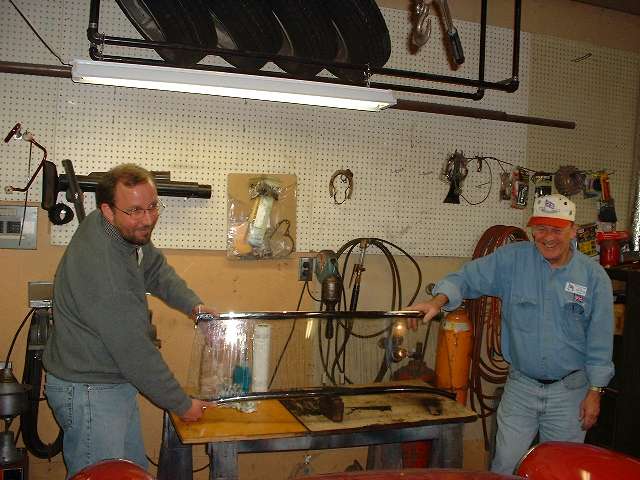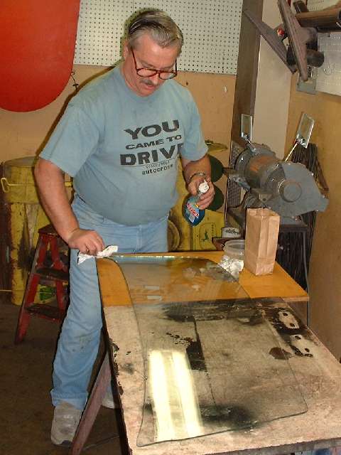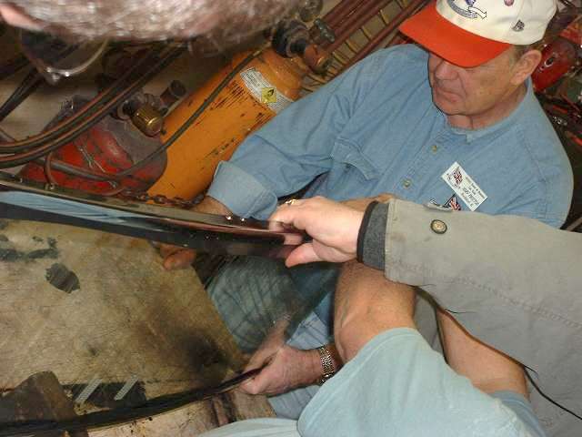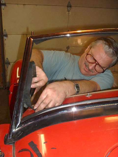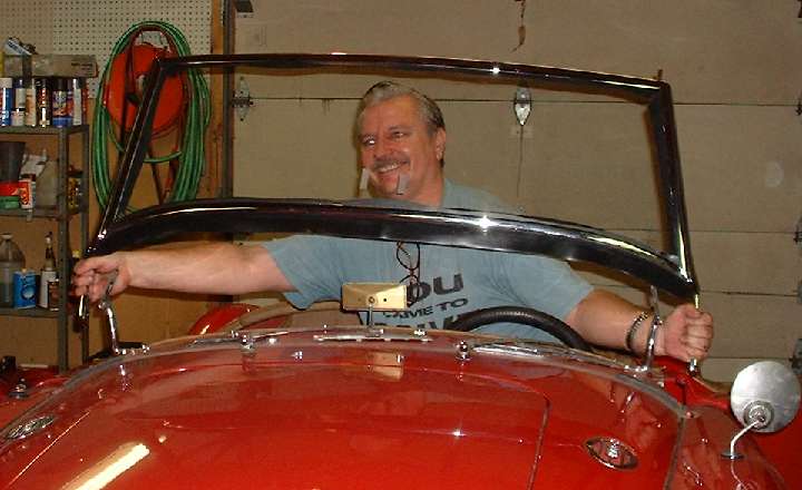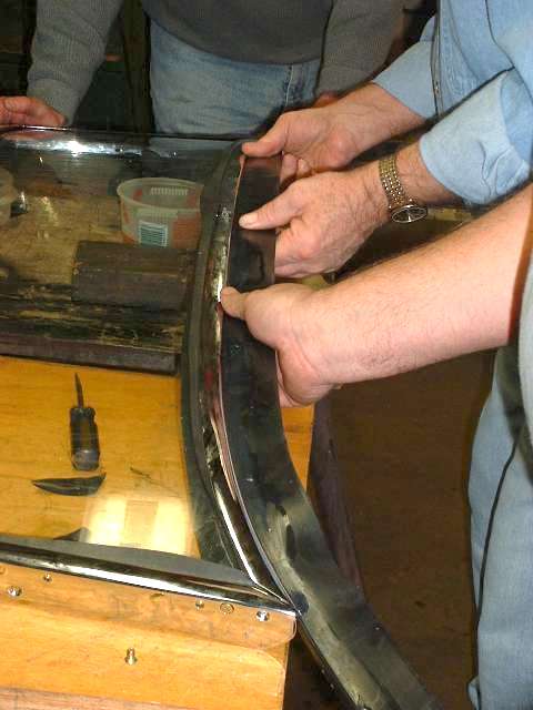 The object of the day was to get this thing assembled and installed on the car. This had been done before, just a few years earlier while installing new glass, but the (cheap) chrome plating job done at that time was bleeding copper stains from the brass base metal to the surface. So this time a spare windscreen frame was processed through a local Harley Davidson motorcycle shop to their favorite vendor for chrome plating. For the Harley crowd good chrome is next to godliness, so this time the finished plating is absolutely astounding.