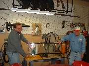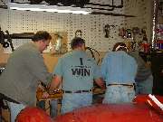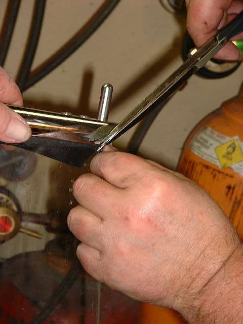 We then turned the glass upright and proceeded to install the top frame rail. A finish cut 2x4 board standing on edge makes a nice 3-1/2 inch block to support the center of the bottom frame so it will readily stand up straight. As with the bottom, the top corner brackets are attached to the top frame first, and the assembly is then installed on the edge of the glass. A little more soapy water on the rubber strip and the top frame goes on easily. A trick to keep in mind here is to keep the rubber strip centered over the edge of the glass so that when the frame is pushed into place there is about equal amounts of the rubber strip on each side. The excess rubber will be trimmed off later, but it must at least fill the entire space inside of the frame. With bottom and top frame rails in place I can relax for a minute while I leave two other guys holding the works. Before installing the side rail it's time to trim the top and bottom rubber strips back at the ends so they don't interfere.