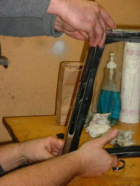 You can wet the rubber "T" seal with slippery stuff again, and just like the thin packing strips it will slide right into place. When your fingers are slippery and the strip drags a bit it can help to have some extra hands again to tug evenly along the length to keep it moving. Note that this rubber strip has an angle on the "T" at the top edge, so the flap should extend forwards from the bottom of the frame, where it will ultimately lie on top of the body cowling extending forward from the base of the windscreen. Once this bottom rubber seal is in place you can close the corner of the frame and reinstall the screws. Then it's just four screws to attach each of the side mounting posts, and YAHOO, we have a complete windscreen assembly ready for installation on the car.