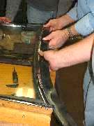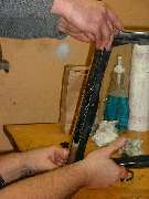 Given enough time, it is advantageous to allow the soapy water film to dry before trying to trim the excess from the thin foam rubber packing piece between the glass and the frame. When the parts are still wet the rubber can easily be pulled out of the joint, and it's not easy to get it back in there. More notes on the trimming process later.