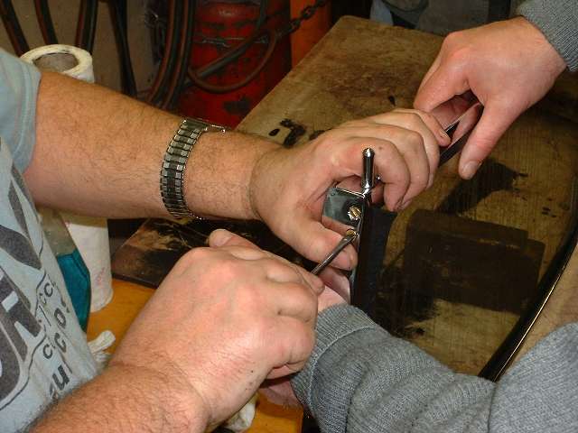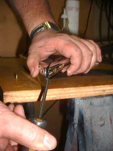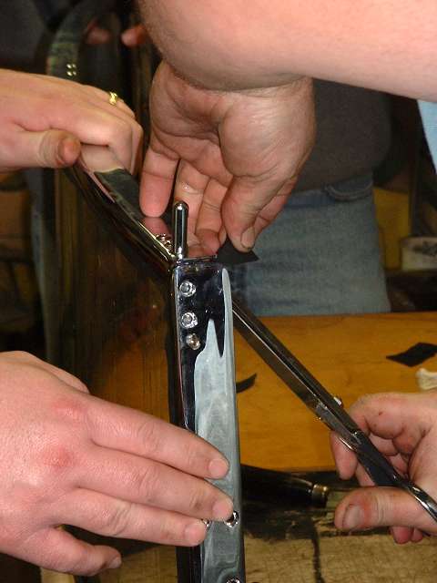 The new windscreen frame was plated and preassembled well in advance of installation day to be sure everything would fit properly. And good that it was, because there are often some problems with the bits and brackets that hold it all together. The original brackets and screws for instance had 2BA standard threads with noticeably small screw heads and pitch of about 30 threads per inch. Replacement brackets and screws installed in the late 80's had SAE or UNF standard #10-32 (32 threads per inch). If you chase a 10-32 tap through the old brackets you can use 10-32 screws, but there's no way you can use the 10-32 brackets with the 2BA screws. Some additional hardware problems are noted below. Most new brackets and screws supplied now should have the original type 2BA threads, but it bears checking both your existing parts and the new parts to be sure they will match.