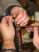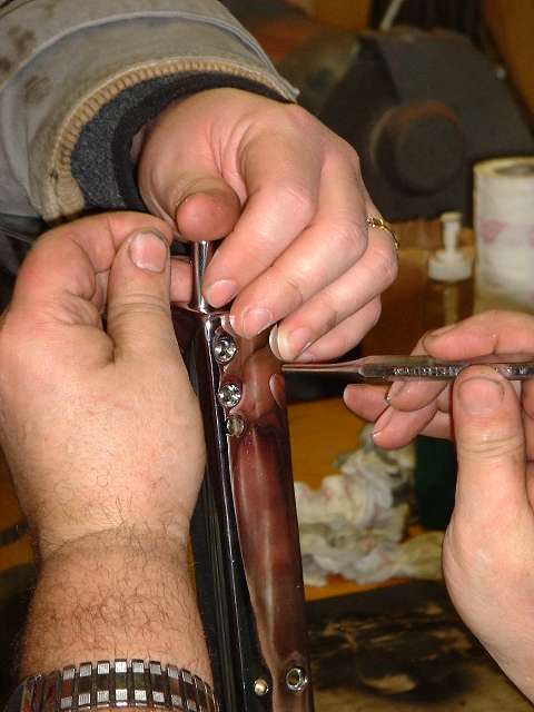 Install the screws loosely into the corner brackets. Then trim the ends of the rubber strip at an angle to match the corner miter of the frame so the rubber will not be trapped in the miter joint, and you can proceed to tighten the screws. It may help to have a small alignment punch handy to nudge the encased bracket into place while getting the screws started. The first two screws from the top are countersunk and serve to align the bracket to the third hole, which will later accept the top screw for the side mounting post.