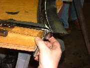Next step is to install the bottom rubber seal strip. This is a wide rubber part with a "T" shape mounded into the top edge. It is relatively thick at the top "T" edge and tapers to be much thinner towards the bottom edge. The "T" shaped edge will slide into a slot in the bottom of the frame, but for this you have to open up one corner of the frame slightly. Loosen or remove the two screws on the side at one bottom corner. Pry the corner of the frame apart about 1/8 inch, which will be enough to allow the rubber strip to be inserted into the slot in the bottom frame rail.